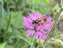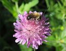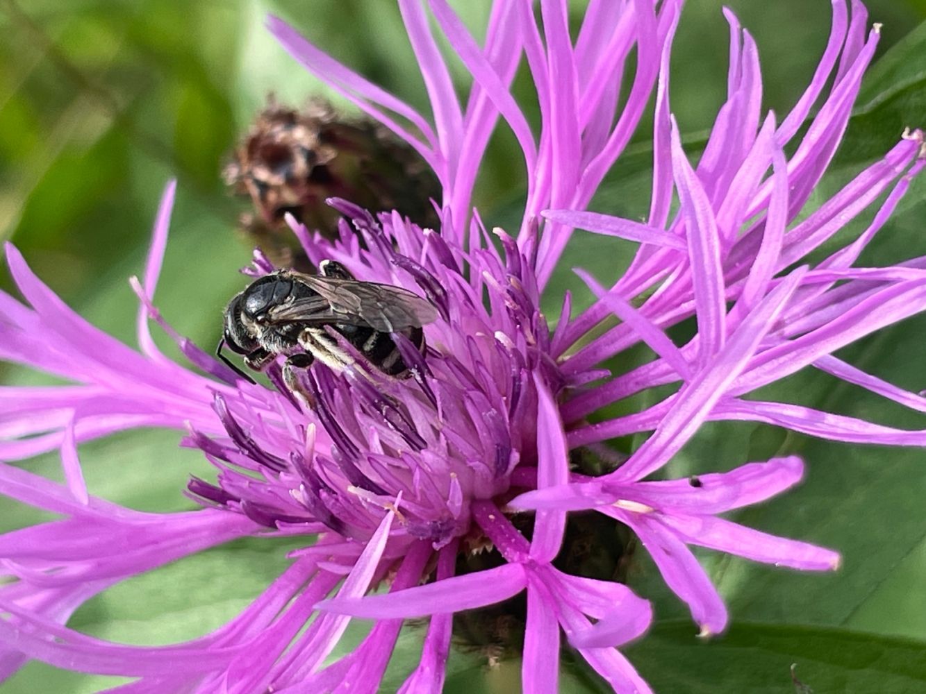 Andrena hattorfiana, femmina, Gola di Lago, giugno 2024. Le femmine di A. hattorfiana sono specializzate sul polline delle Caprifoliaceae (principalmente Knautia ma anche Scabiosa a fine stagione). Foto di D. Besomi