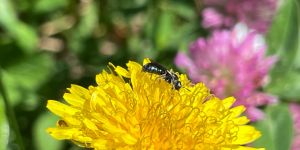 maschio, condivide un fiore di tarassaco con un'ape mellifera